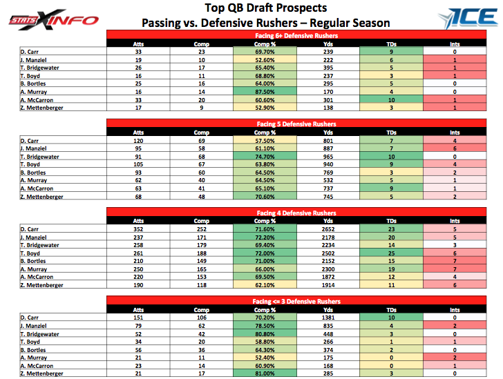 Manziel looks great considering these are stats that measure only passing and that is where he is most questioned. It is also interesting to note that Manziel was a better passer against the SEC than Bortles was against the AAC (and that does not even take into consideration mobility). Carr looks bad in almost every metric. There is a significant difference between him and even the 3rd best guy they measured. I think these stats would be far more valuable if they had done them in years past (or went back now), and could show the correlation (or lack thereofI) between these stats and future NFL success. For instance, did Vince Young's high completion percentage come with a crazy amount of passes shorter than 10 yards? Did Blaine Gabbert in a spread offense look good in these stats? Could Andrew Luck's success be foretold by what he did against the blitz? Give me 10 years of history to compare to so I know the value of what I'm looking at. |